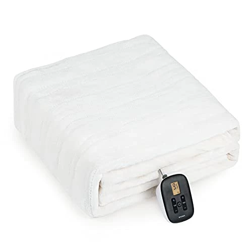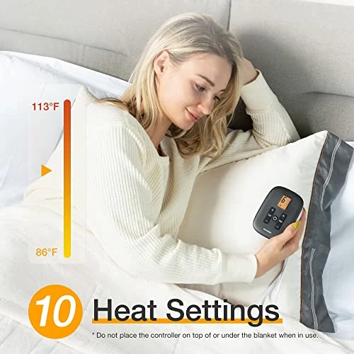 - [Customized Settings] Use the controller to easily switch between the 10 heat levels from 86℉ to113℉. Set from 0.5h to 12h Auto-Off (0.5/1h increments) to reserve the length of your heating time; This heated blanket is equipped with a 19-feet extra-long cord to offer maximum flexibility and convenience.