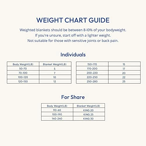 - [BETTER WEIGHT CHOICE]: Like a much-needed hug, we recommend choosing a blanket that accounts for 10% of your body weight or 10% of the total weight of you and your partner.