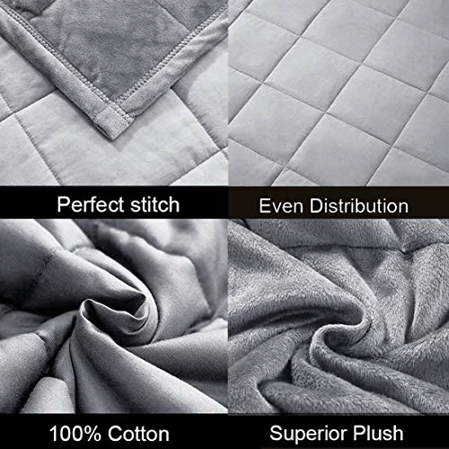 - Cool& Warm 2 in 1 Innovative Design– Designed as double sides for reversible use. One side made of 100% breathable cotton (400TC) which provides a silky touch and coolness, making it the perfect choice for hot and perspire sleepers. The other side uses fuzzy plush material that is soft to the touch. It’s great for the winter time or anywhere where the nights tend to be cool. Now you can use our weighted blankets in all season and say goodbye to those old fashion adult weighted blankets.