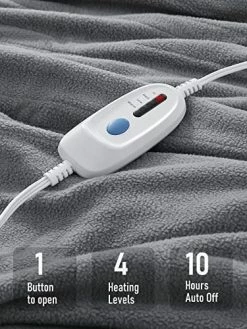 Easy one-touch built-in remote Ultra-plush fabric 4 Heat settings 4 Hour automatic shut-off for safety Machine washable Dimensions: 50 inches x 60 inches Hand Wash Instructions: Hand wash in cold water using a small amount of mild laundry soap or detergent Do not rub or scrub Rinse thoroughly in cool water until all traces of soap or detergent are gone Lightly squeeze excess water out by hand Drying Instructions: Tumble dry on low heat Ensure that this product has enough room to tumble freely Do not use a commercial dryer Do not iron this product Line dry by draping over two parallel clotheslines or a shower rod