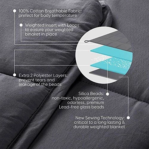 - The ultra-breathable, 100%-cotton outer layer is lined with non-glue polyester padding and two extra polyester layers that contain millions of premium micro glass beads. This structure provides optimal temperature control and guarantees that our blankets never leak beads.