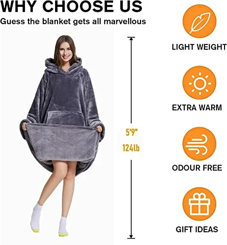 - PERFECT GIFT: Warm oversized blanket has been working on the improvement of the comfort and practicality, combines the comfort of your favorite hooded blanket with the warmth of the plush long hooded bathrobe. You will love and enjoy using our blanket sweatshirt or giving it as a gift to a loved one or friend!