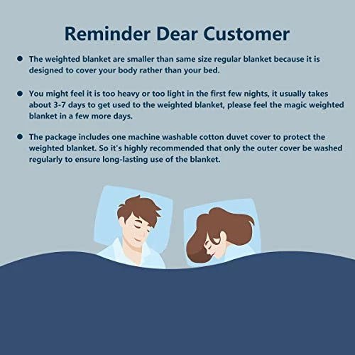 - Elaborate Design and Workmanship: The heavy weighted blanket is constructed with a 7-layer structure and 5×5 inches smaller pockets, that can ensure the glass beads evenly distributed in each pocket. The 10 corner ties cotton duvet cover also secures your blanket in an ultra-precise fit away from slipping, that keeps comfortable sleeping all night.