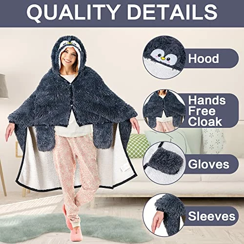 Happy Fuel Penguin Wearable Hooded Blanket For Adults – Fluffy Super Soft Shaggy Faux Fur, Fuzzy Warm Cozy Plush Furry Fleece & Sherpa Hoodie Throw Cloak Wrap – Penguin Gifts For Women Adults And Kids Charcoal