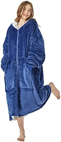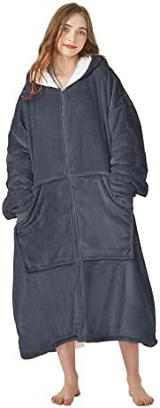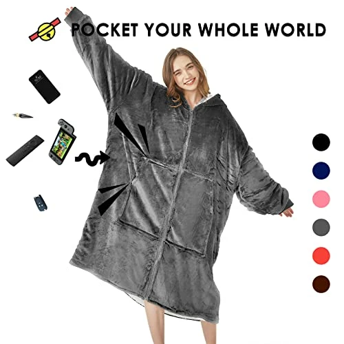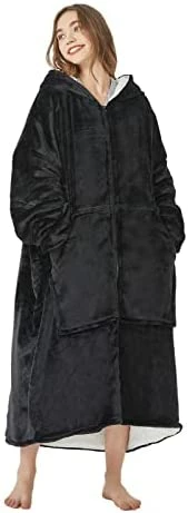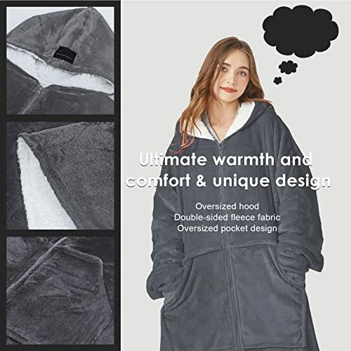 - 【Stylish & Simple Design】This wearable blanket for womens and mens is designed with a unique hood, zipper and large pockets in one, large side pockets can help you organize things better and keep your hands warm, the delicate zipper design helps You put it on and off easily, and the oversized hood not only helps you protect against cold winds but also keeps your head warm