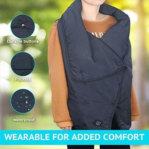 - ★Multipurpose Use:With zippers and snap buttons, you could use the heated blanket as a cushion, throw blanket, shawl & sleeveless jacket;By compressing it into pillow size weighing only 1.6 lbs