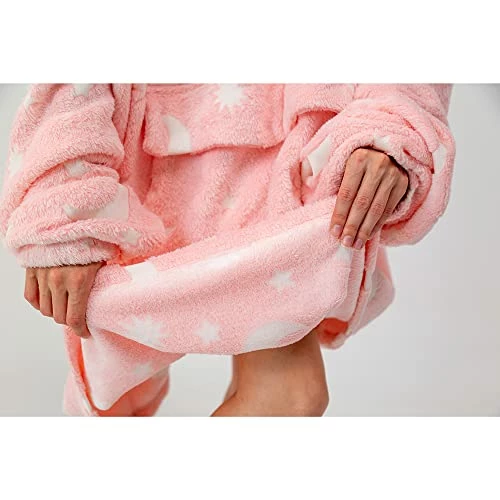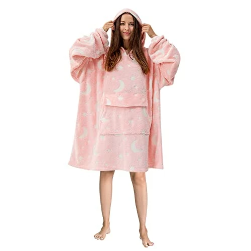 Mewkou Glow In The Dark Wearable Blanket Hoodie For Adult Women Men,Oversized Sherpa Sweatshirt Wearable Blanket With Giant Pocket,Super Warm Soft Flannel Hooded Blanket,Luminous Moon And Stars