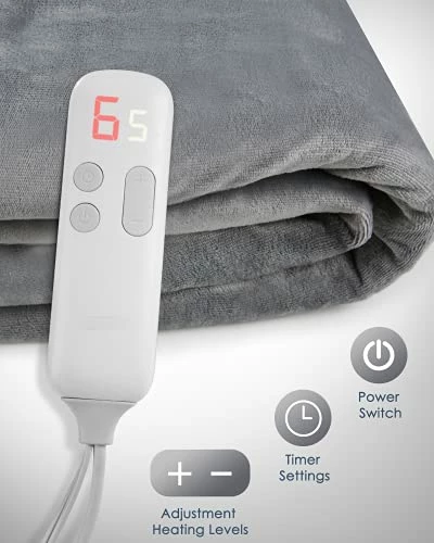 Specification: Size:50inch x 60inchin Color: Grey & White Power Supply:Wall Adapter Heat Area: Full Body Material: Flannel Heat Level: 6 Levels Aoto-off TimingL: 5H Features 1.The heated throw blanket (50×60 inches) cuddles you warmly while heating rapidly with 6 optional levels and provide maximum comfort to combat cold weather 2.The side with silky flannel and the other side with sherpa shu velveteen bring optimal sense of comfort, both sides working efficiently to preserve heat for further warmth 3.1 to 5 hours of timing setting to meet individual needs. When the set timer is run out, the product will stop heating automatically to ensure energy saving and safety for you 4.The detachable controller and the washable fabric materials helps maintain the hygienic and soft use of this electric warming blanket for years to come 5.Quality and safety of the heat blanket is certified by ETL certification; The heating wires are uniquely placed for more uniform heat distribution with overheat protection system to enhance safer user experience