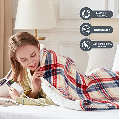 - [VERSATILE BLANKET] Imagine you are snuggling on the couch at movie nights, a heating blanket throw electric definitely beats bundling up. Heat blankets electric could also be an office blanket: Arrive at work and notice you could show off your new top without being freezing. Soft heat electric blanket could just be normal sherpa blankets: unplug the heated throw and take it anywhere, extra buttons design to ensure you are wearing a stylish poncho without notice. Sure be gifts for any occasions.
