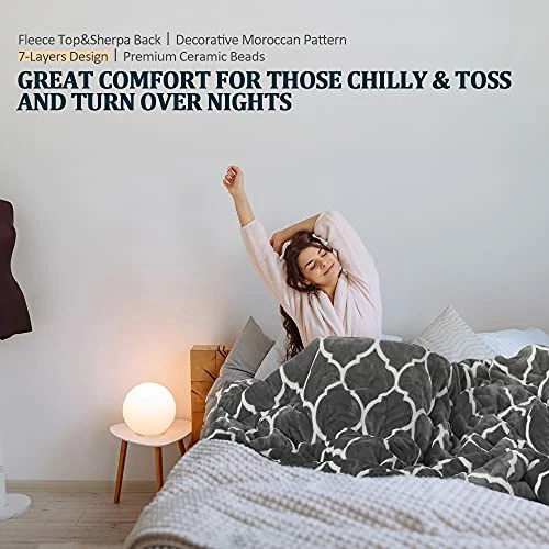 - Better Quality Leads to Better Sleep: The weighted blanket is made of 220 GSM fleece and 220 GSM plush Sherpa which provide you with different softness and coziness, combined with the Moroccan pattern design, it creates a unique style. A heavy blanket helps around your body while giving you the feeling of calm & being hugged, and enjoy a deep and peaceful sleep