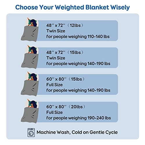 - Choose Wisely & Worry-Free Support: It is recommended to choose a weighted blanket that weighs 8% to 10% of your body weight. It may take 2 to 7 days to get used to the weight, start off with a lighter weight as you like. Here at Cottonblue we offer 30-day free refund and lifetime support.